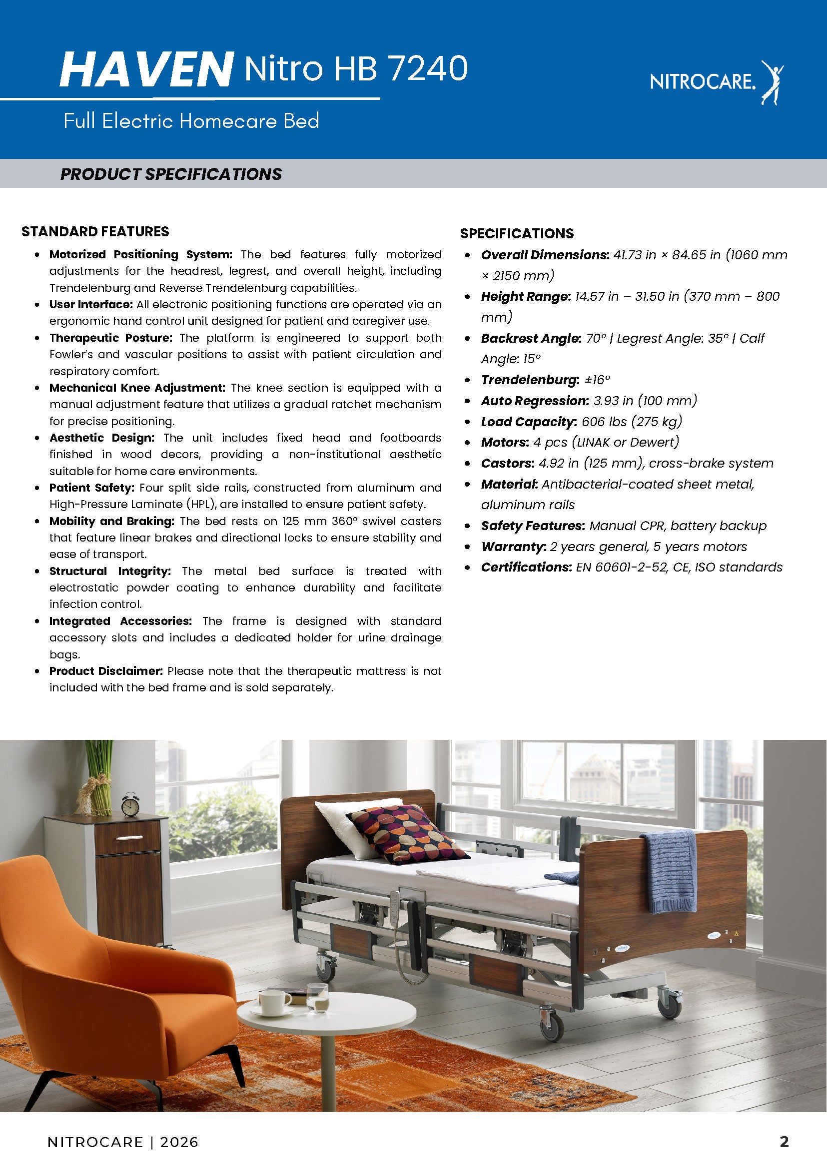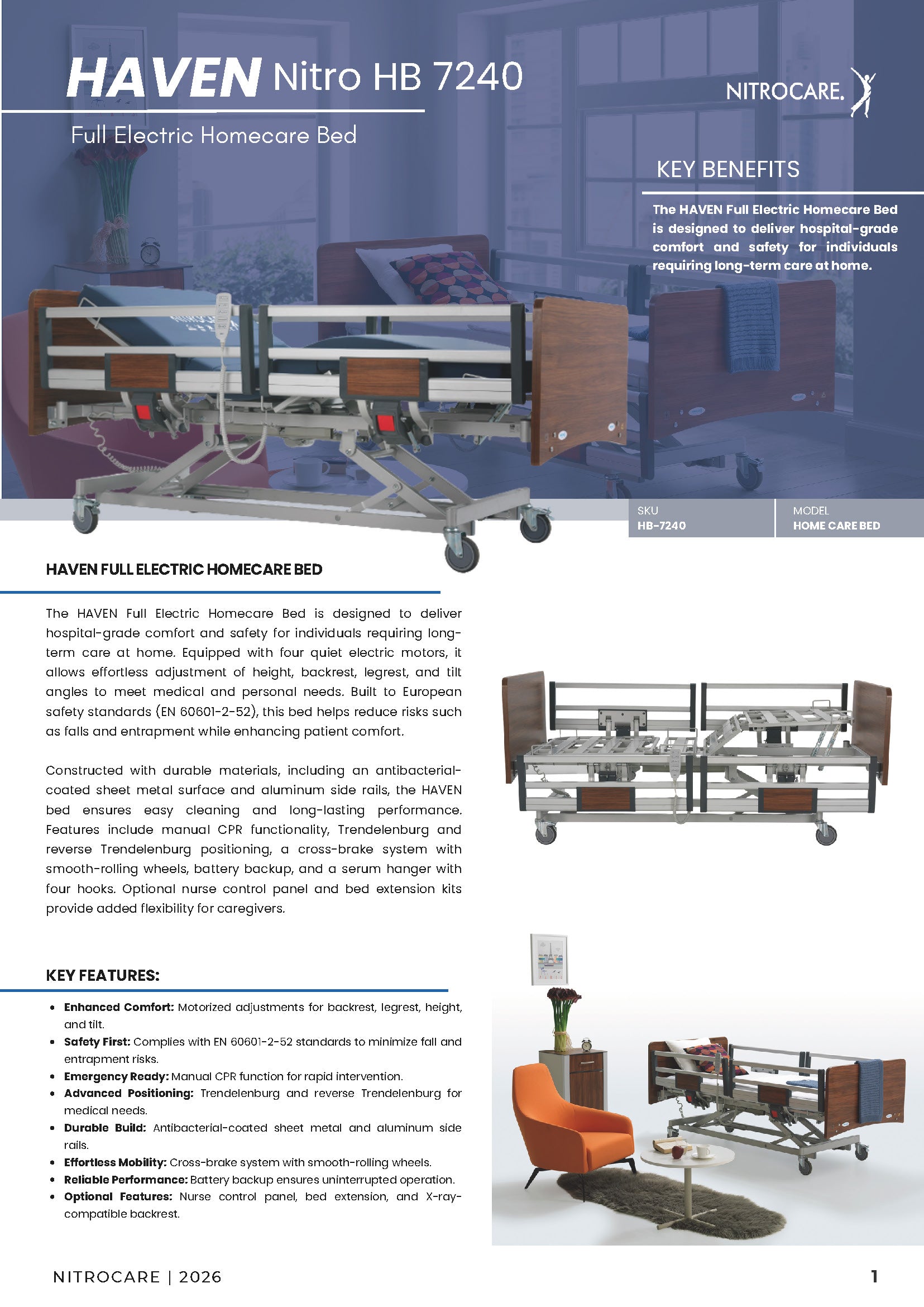 The Nitrocare Haven is a high-performance, full-electric homecare bed engineered to satisfy the rigorous technical requirements of acute recovery while maintaining a refined, non-institutional aesthetic. By integrating a low-decibel, high-torque actuator suite, the system provides smooth and synchronized 4-section articulation for precise therapeutic positioning. This advanced biomedical engineering ensures that critical adjustments to the headrest, leg rest, and height—including Trendelenburg and Reverse Trendelenburg positions—are achieved with minimal disruption to the patient’s rest and recovery cycle. The structural design prioritizes high-acuity safety, featuring precision-fit aluminum side rails and a manual CPR release for rapid emergency leveling, ensuring full compliance with international IEC 60601-2-52 medical standards.