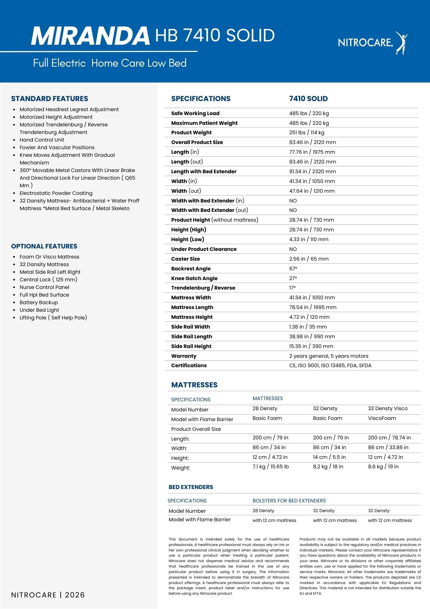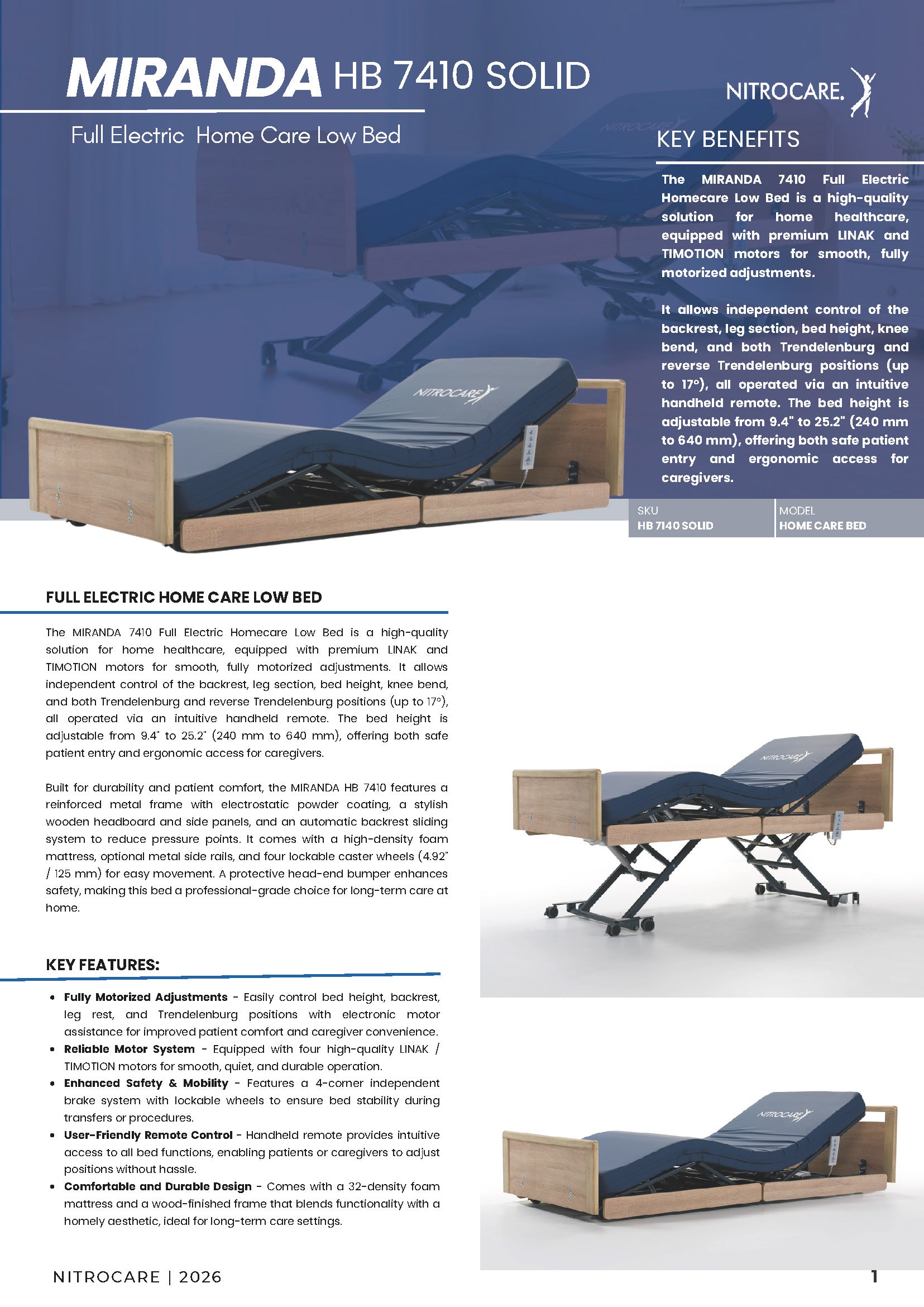 The transition to home-based care should never require a compromise on patient safety or home dignity. The Nitrocare Miranda 7410 addresses the primary challenge of residential recovery: managing the risk of falls without creating a cold, clinical environment. By integrating a full-electric, high-precision motor system into a warm, wood-finished aesthetic, the Miranda 7410 transforms the patient's room into a recovery suite rather than a hospital ward. It empowers the user with independence through its easy-to-use remote while providing the structural rigor necessary for serious medical support.