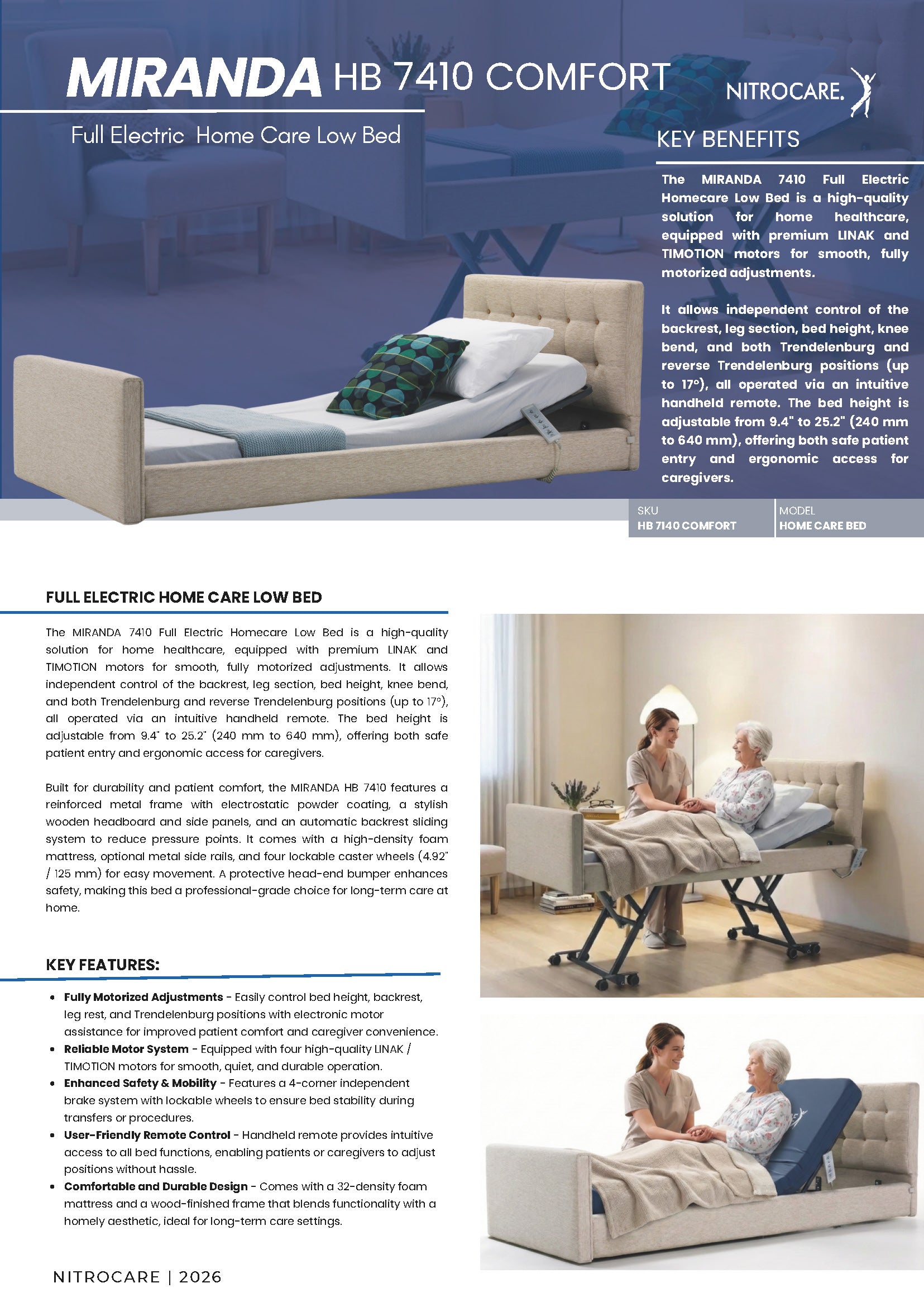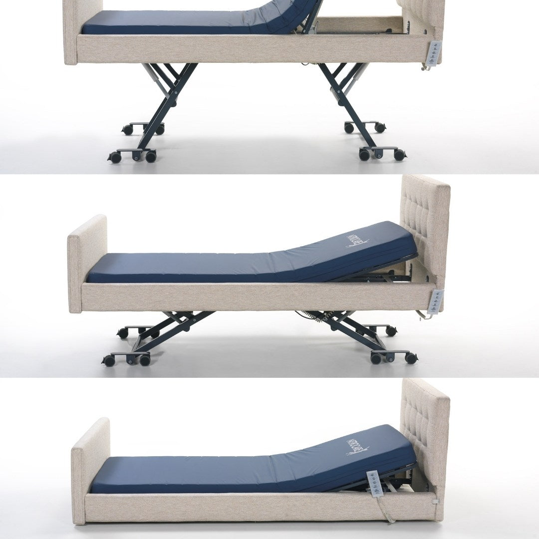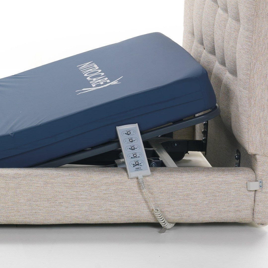 The Nitrocare Miranda 7410C is a high-performance, 4-motor full electric homecare bed designed to provide intensive clinical support within a sophisticated residential aesthetic. Engineered to eliminate the institutional feel of traditional medical furniture, this unit features a premium upholstered soft-shell design that integrates seamlessly into home interiors while offering investment-grade durability. The advanced 4-motor system enables precise, motorized adjustments of the headrest, leg rest, and height, including therapeutic Trendelenburg and Reverse Trendelenburg positions (17 degrees), all managed via an intuitive ergonomic hand control. By automating complex positioning, the Miranda 7410C reduces the physical burden on caregivers and enhances patient autonomy, making it a critical asset for long-term recovery and chronic care management.