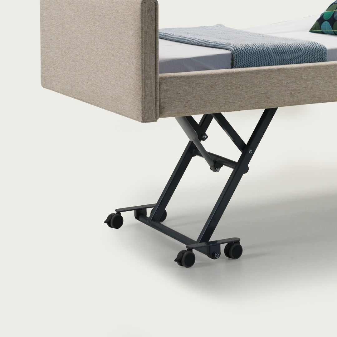 Optimized for the modern household, the Miranda 7410C features a streamlined spatial footprint of 210 cm / 82.7 in in length and 125 cm / 49.2 in in width, ensuring it can pass through standard residential doorframes without difficulty. Despite its compact exterior, it offers an expansive sleep surface of 105 cm / 41.3 in, providing significantly more room than standard hospital twins to enhance user comfort and prevent pressure injuries. With a height range that adjusts from an ultra-low 11 cm / 4.3 in to a maximum of 73 cm / 28.7 in, the bed serves as a primary fall-prevention tool while maintaining the ideal ergonomic height for caregiver interventions. This combination of clinical precision and thoughtful proportions allows families to maximize facility-grade care in existing bedrooms without the need for structural modifications.
