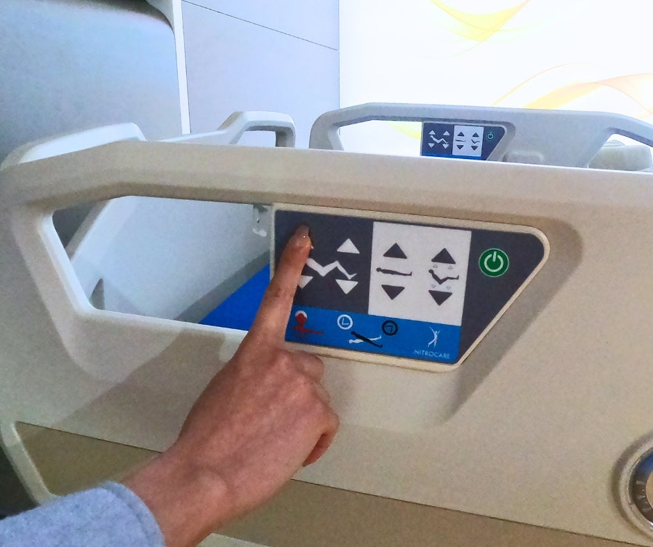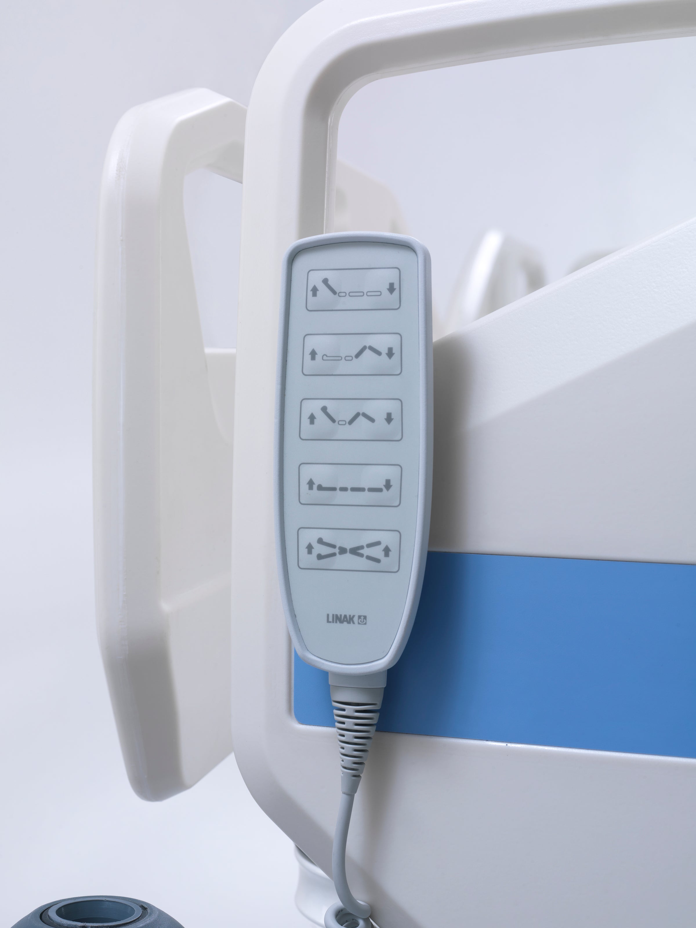 The Smart Egress feature provides secure comfort by using a control (handset) that easily positions the patient within the bed or brings the bed to the safest height and position for them to exit.