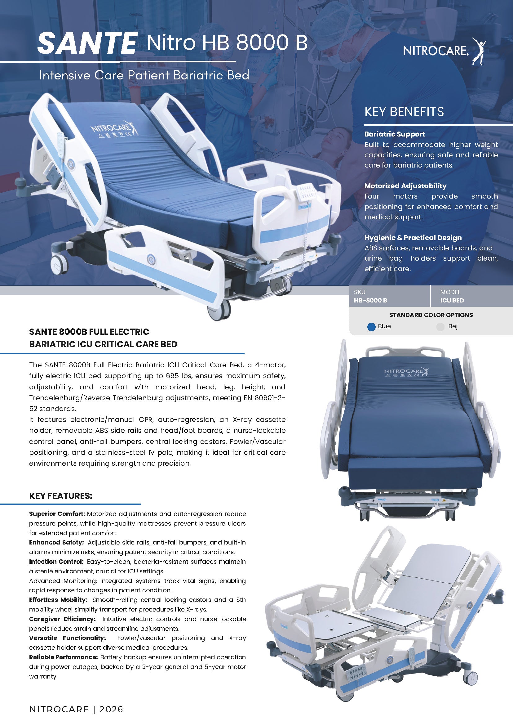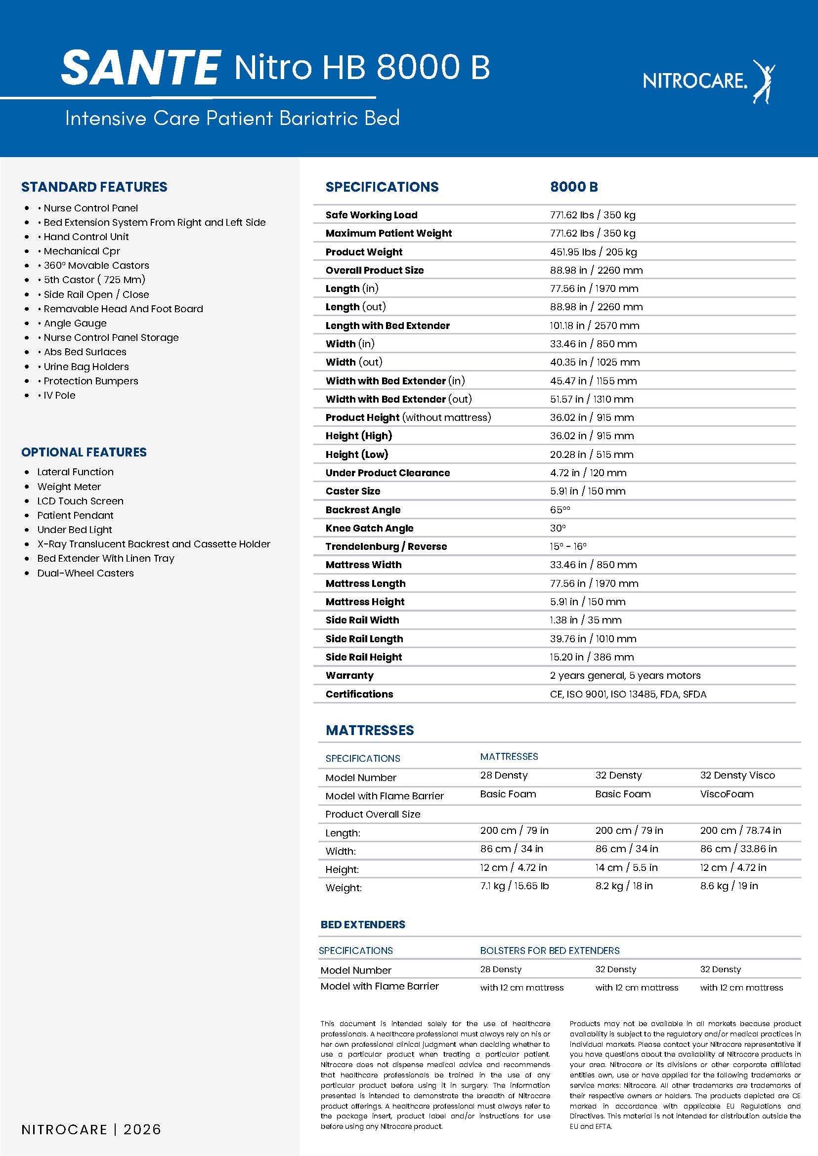Bariatric critical care presents a unique set of challenges where equipment failure is not an option. The Nitrocare SANTE 8000B is an investment-grade solution engineered to handle the most demanding ICU environments. By providing a massive 350 kg / 771.6 lbs safe working load without compromising on clinical precision, this bed eliminates the limitations often found in standard critical care furniture. It transforms bariatric nursing from a high-strain task into a manageable, safe, and dignified process.