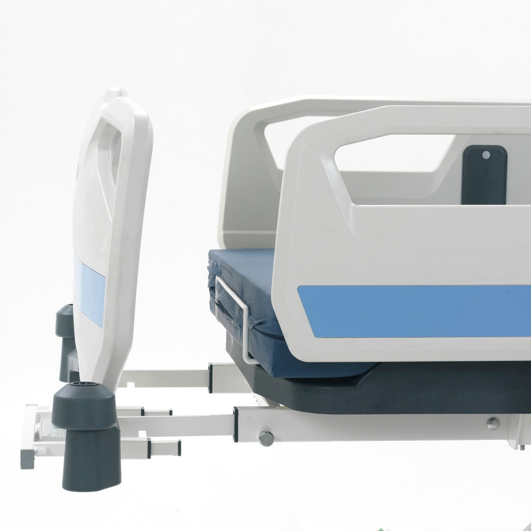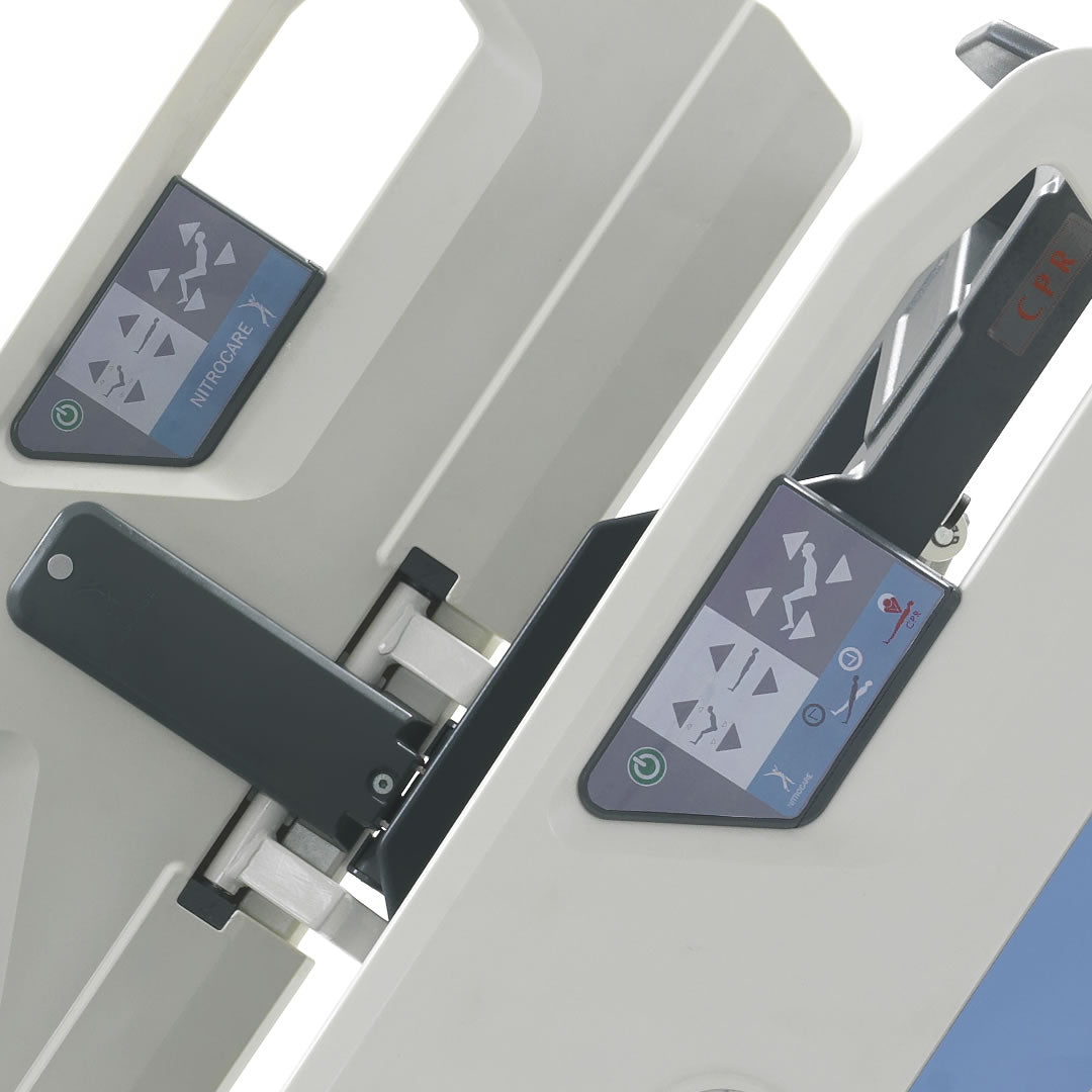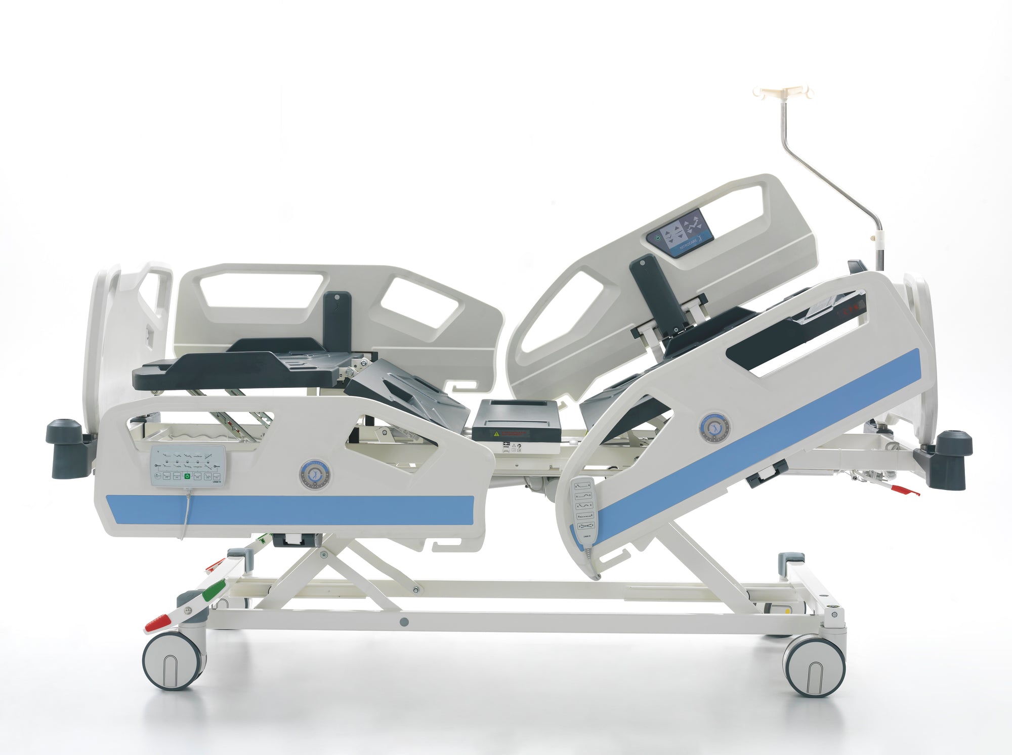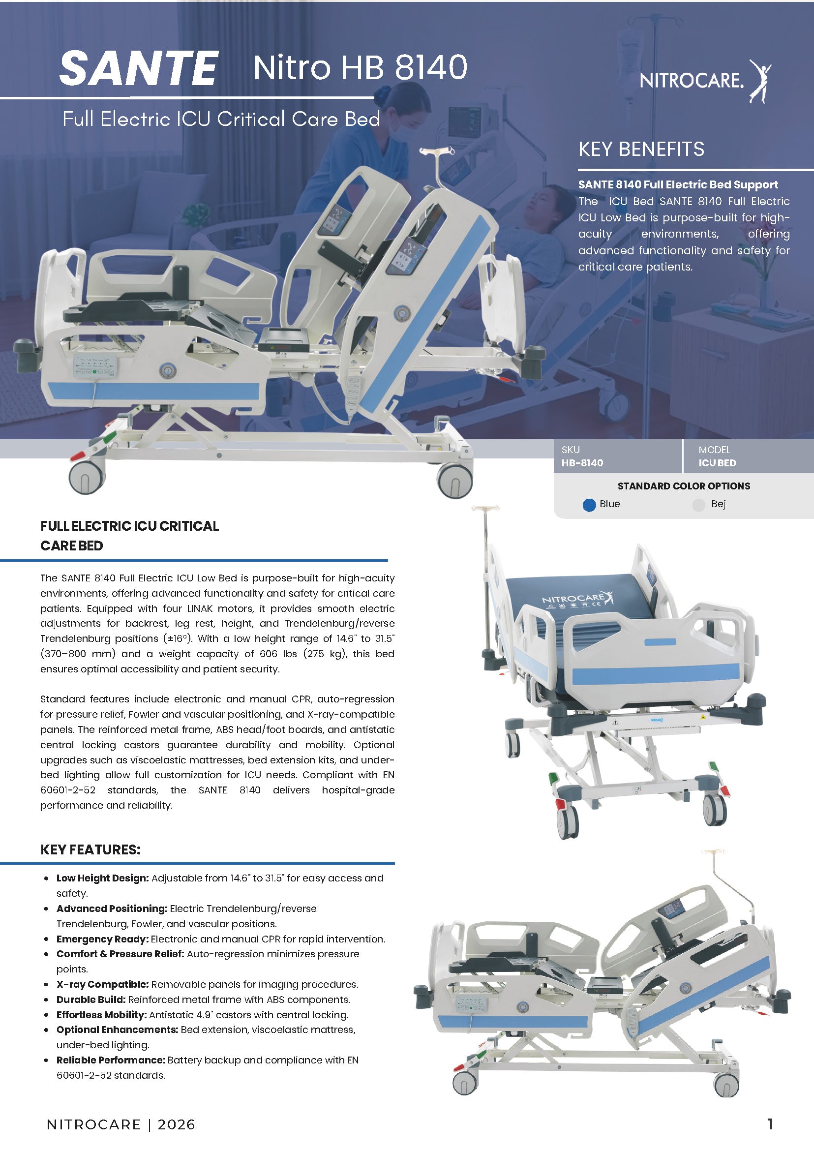 Standard features include electronic and manual CPR, auto-regression for pressure relief, Fowler and vascular positioning, and X-ray-compatible panels. The reinforced metal frame, ABS head/foot boards, and antistatic central locking castors guarantee durability and mobility. Optional upgrades such as viscoelastic mattresses, bed extension kits, and under-bed lighting allow full customization for ICU needs. Compliant with EN 60601-2-52 standards, the SANTE 8140 delivers hospital-grade performance and reliability.